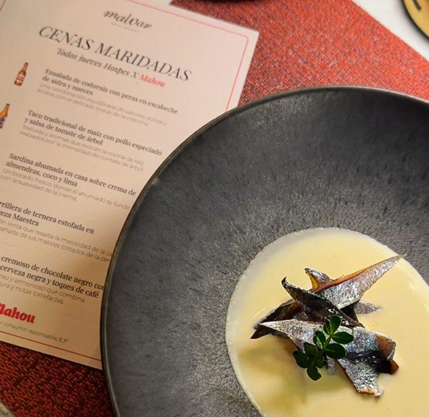 Sardina ahumada en casa sobre crema de almendras, coco y lima, maridado con Mahou Reserva. (Alérgenos: crustáceo, pescado, molusco, frutos de cascara, sulfitos).