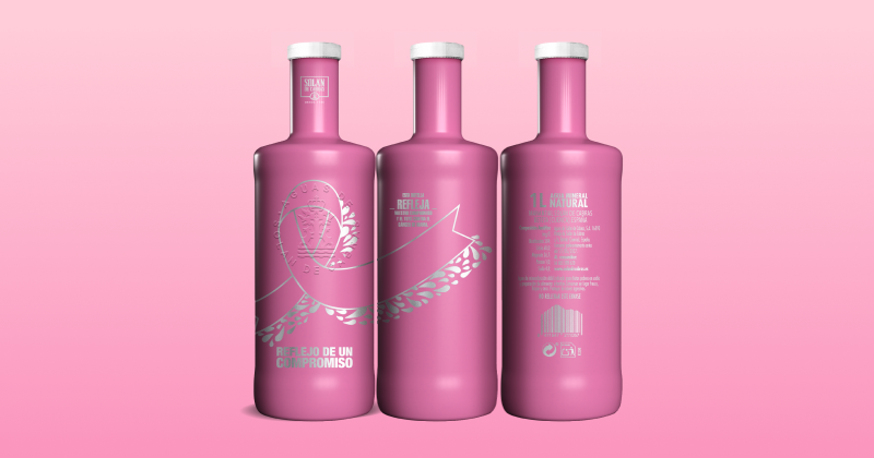 Una botella abrazada por el lazo representativo de la lucha contra el cáncer de mama que demuestra nuestro apoyo a la causa. El 100% de los beneficios son destinados a la causa.